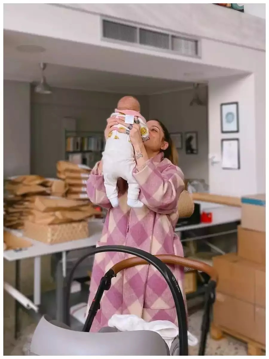 «Έχουν υπάρξει άπειρες στιγμές όπως αυτό στην φωτογραφία: με το μωρό αγκαλιά να προσπαθώ να δουλεύω είτε από το σπίτι, είτε στον υπολογιστή, είτε στο γραφείο, είτε στην φωτογράφηση για την καινούργια μας παλέτα Χριστοπουλάκι έχει τον έλεγχο σε όλα!!!! Ps.: δείτε πως μου κρατάει το χέρι», είχε γράψει στην ανάρτησή της η Ανίτα Μπραντ.