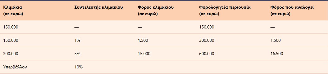 ΣΗΜΕΙΩΣΗ: Μετά την 26η-1-2010, όταν κληρονόμος είναι σύζυγος ή ανήλικο τέκνο του κληρονομουμένου, απαλλάσσεται από το φόρο κληρονομιάς αξία κληρονομιαίας περιουσίας μέχρι 400.000 ευρώ για κάθε κληρονόμο (με αντίστοιχο περιορισμό των κλιμακίων υπολογισμού του φόρου της Α’ κατηγορίας).
