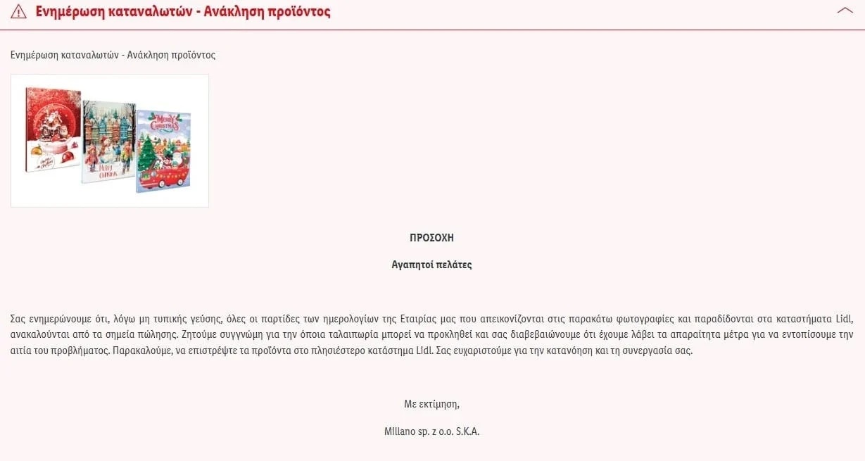 Η LIDL Eλλάς για την ανάκληση των γλυκισμάτων που αφορά χριστουγεννιάτικα σοκολατάκια που πωλούνται μαζί με τα γνωστά advent calendar.
