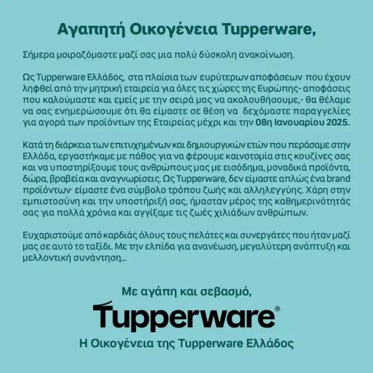 Σήμερα μοιραζόμαστε μαζί σας μία πολύ δύσκολη ανακοίνωση. Ως Tupperware Ελλάδος, στα πλαίσια των ευρύτερων αποφάσεων που έχουν ληφθεί από τη μητρική εταιρεία για όλες τις χώρες της Ευρώπης- αποφάσεις που καλούμαστε και εμείς με τη σειρά μας να ακολουθήσουμε- θα θέλαμε να σας ενημερώσουμε ότι θα είμαστε σε θέση να δεχόμαστε παραγγελίες για αγορά των προϊόντων της εταιρείας μέχρι και την 8η Ιανουαρίου 2025.