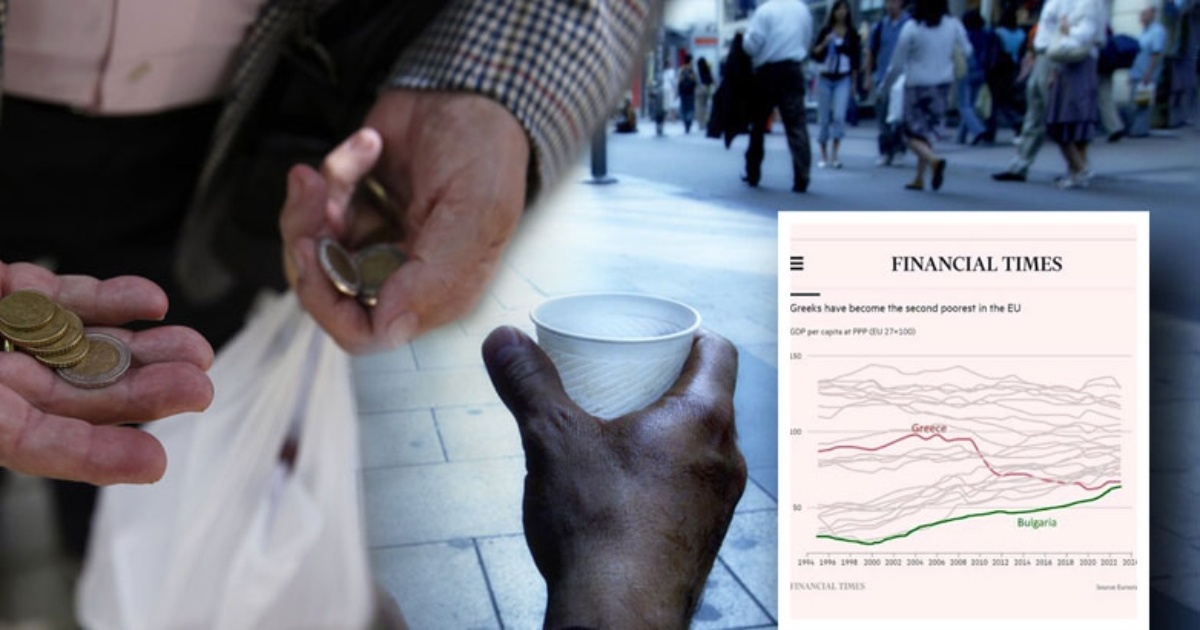Οι Έλληνες είναι οι φτωχότεροι στην ευρωζώνη και οι δεύτεροι φτωχότεροι στην ΕΕ πίσω μόνο από τη Βουλγαρία, όπως φαίνεται και στα στοιχεία που έχουν συγκεντρώσει οι Financial Times από τη Eurostat. Και μάλιστα με τους γείτονες να έχουν ανοδική τάση και να ετοιμάζονται για το προσπέρασμα.