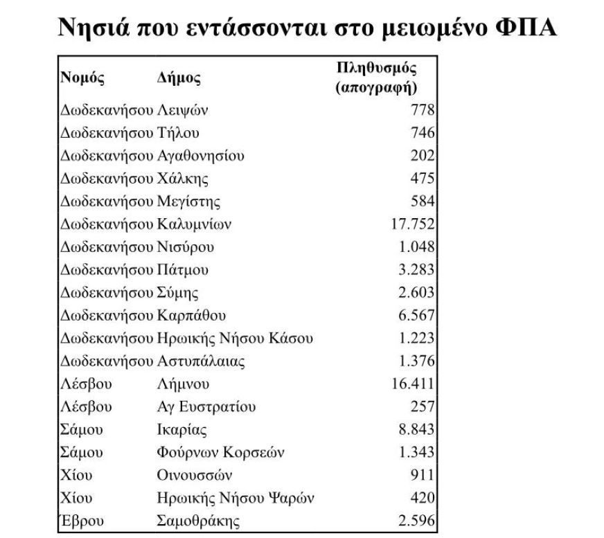 Πλέον, με την κυβερνητική εξαγγελία στο καθεστώς του μειωμένου ΦΠΑ εντάσσονται οι παρακάτω περιοχές: