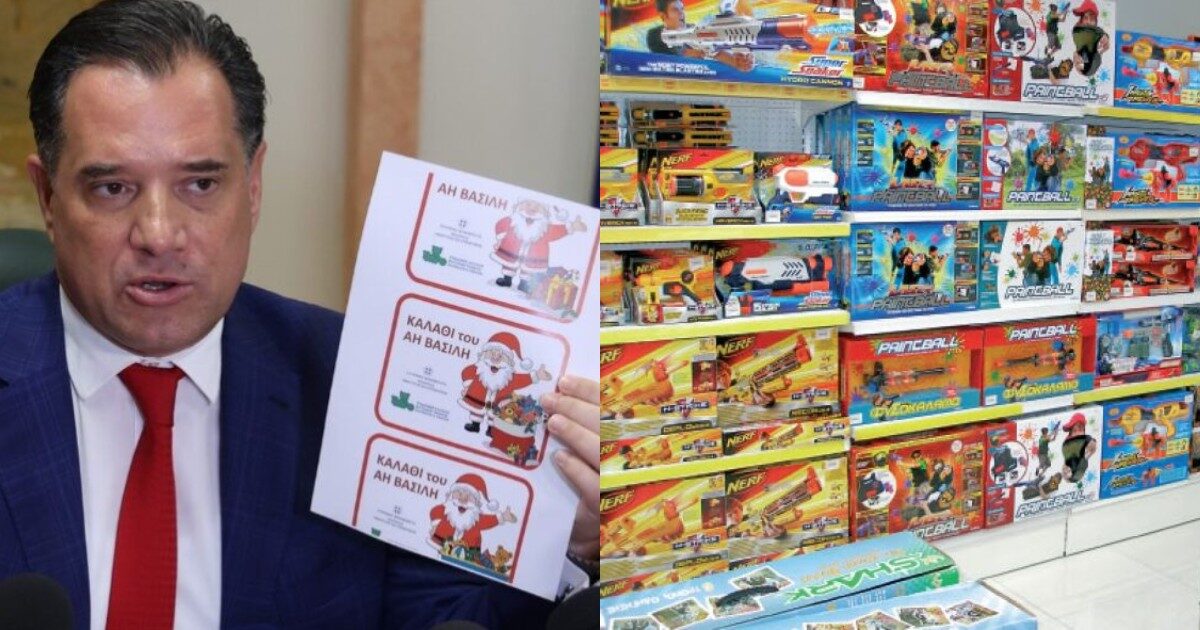 Αντί για μελομακάρονα… ο υπουργός Ανάπτυξης Άδωνις Γεωργιάδης έφτιαξε το καλάθι του Άγιου Βασίλη με παιδικά παιχνίδια.