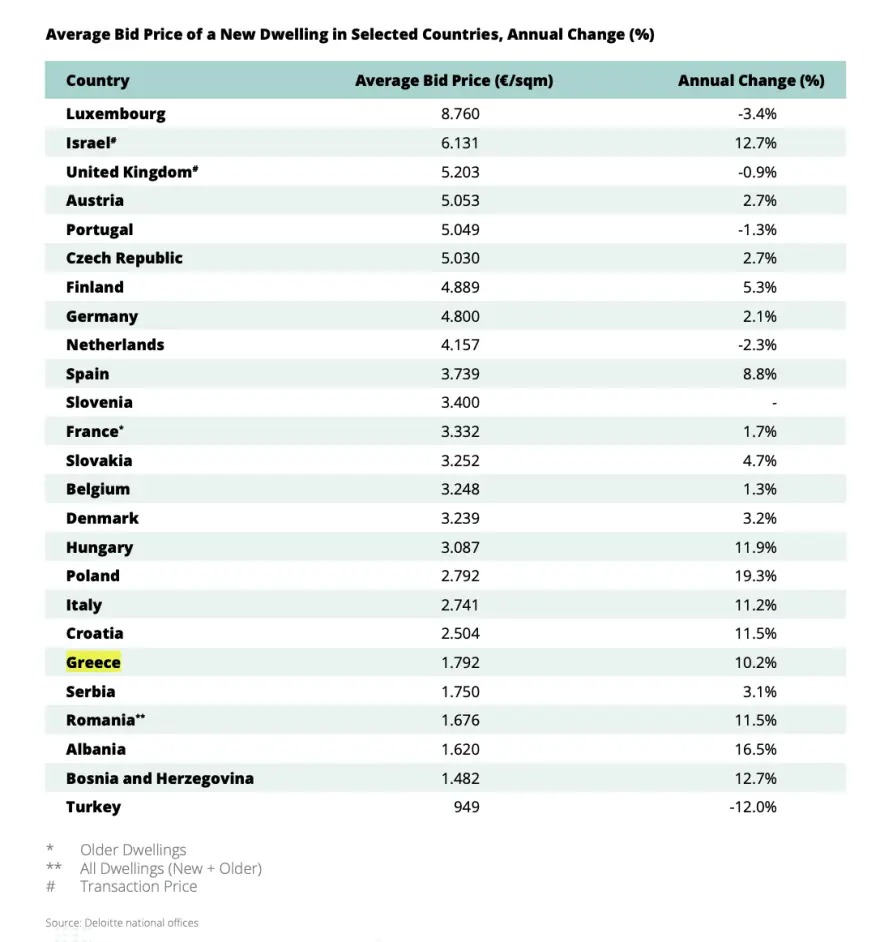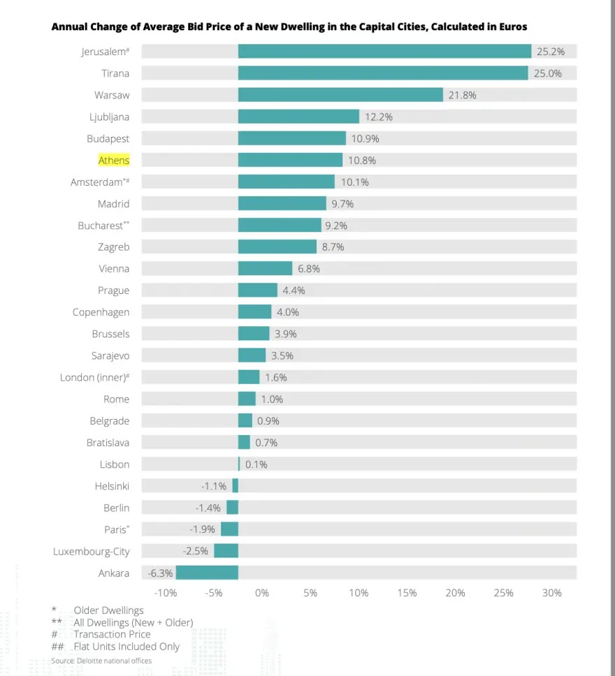 Τα στοιχεία προέρχονται από την τελευταία μελέτη σε 28 χώρες ανά την Ευρώπη της Deloitte, της γνωστής εταιρείας παροχής ελεγκτικών, φορολογικών, συμβουλευτικών, χρηματοοικονομικών και λοιπών υπηρεσιών που μετρά μέσω των κατά τόπους γραφείων της κάθε χρόνο τις επιδόσεις της αγοράς κατοικίας.