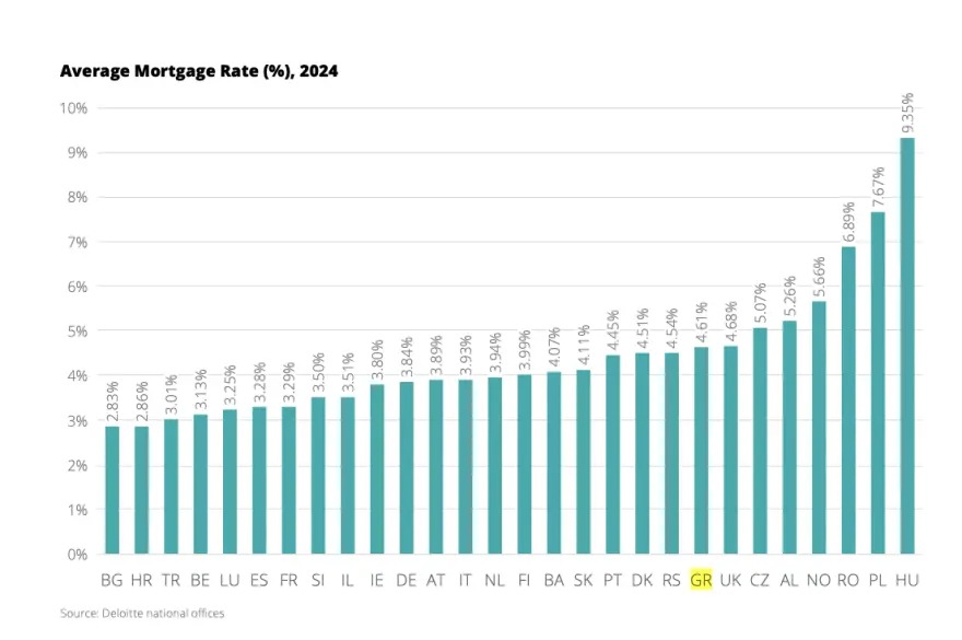 Η Deloitte αναλύει και την εικόνα στην αγορά στεγαστικής πίστης, δεδομένου ότι «τα επιτόκια παίζουν καθοριστικό ρόλο στη διαμόρφωση του κόστους δανεισμού και της συνολικής προσιτότητας της στέγασης. Λόγω των μακροοικονομικών συνθηκών και των πολιτικών των κεντρικών τραπεζών, τα επιτόκια στεγαστικών δανείων εξακολουθούν να ποικίλλουν σημαντικά μεταξύ των χωρών».