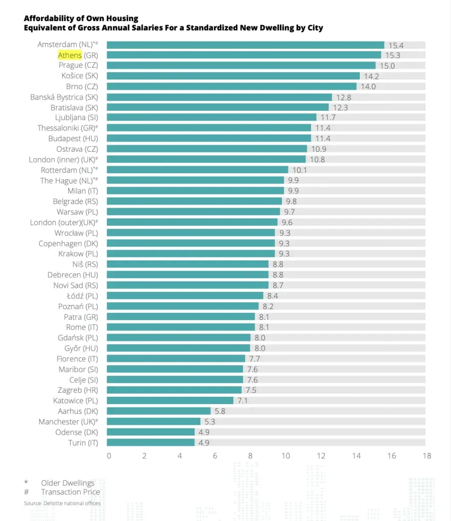 Η Ελλάδα έχει δεύτερη χειρότερη επίδοση μετά τους Ολλανδούς που έρχονται πρώτοι στην Ευρώπη αφού θα πρέπει να πληρώσουν 15,4 φορές το ετήσιο ακαθάριστο εισόδημά τους για αγορά κατοικίας στο Άμστερνταμ.
