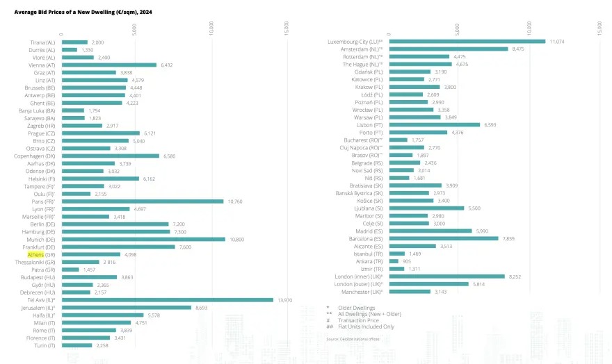 Σε επίπεδο πόλεων η Αθήνα είναι σαφώς υψηλότερα -όχι πάντως και πολύ ψηλά- σε σύγκριση με τις υπόλοιπες αγορές ανά την Ευρώπη με ένα μέσο όρο στις τιμές πώλησης για τις νέες κατοικίες, όπως αναφέρεται στην έρευνα της Deloitte, στα 4.098 ευρώ ανά τ.μ.. Σε επίπεδο πόλεων, το Τελ Αβίβ στο Ισραήλ παραμένει στην κορυφή της λίστας, όπου η τιμή ενός νέου διαμερίσματος φτάνει κατά μέσο όρο τα 13.970 ευρώ ανά τ.μ., ενώ στη Γηραιά Ήπειρο, η πόλη του Λουξεμβούργου είναι πολύ ακριβή με μία μέση τιμή στα νέα σπίτια στα 11.074 ευρώ ανά τ.μ., με τη Φραγκφούρτη και το Παρίσι να ακολουθούν με τιμές στα 10.800 ευρώ ανά τ.μ. και 10.760 ευρώ ανά τ.μ..