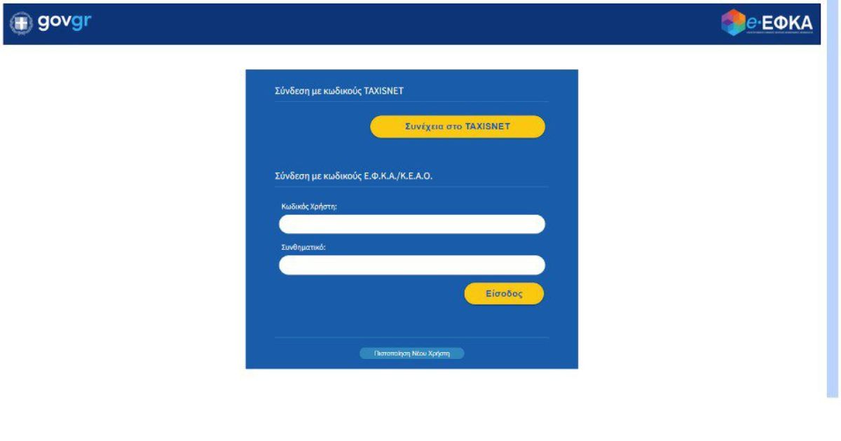 Το σύστημα μας βγάζει το εξής ψηφιακό περιβάλλον και μας δίνει δύο επιλογές είτε να εισέλθουμε με κωδικούς του ΕΦΚΑ ή με τους κωδικούς στο taxisnet