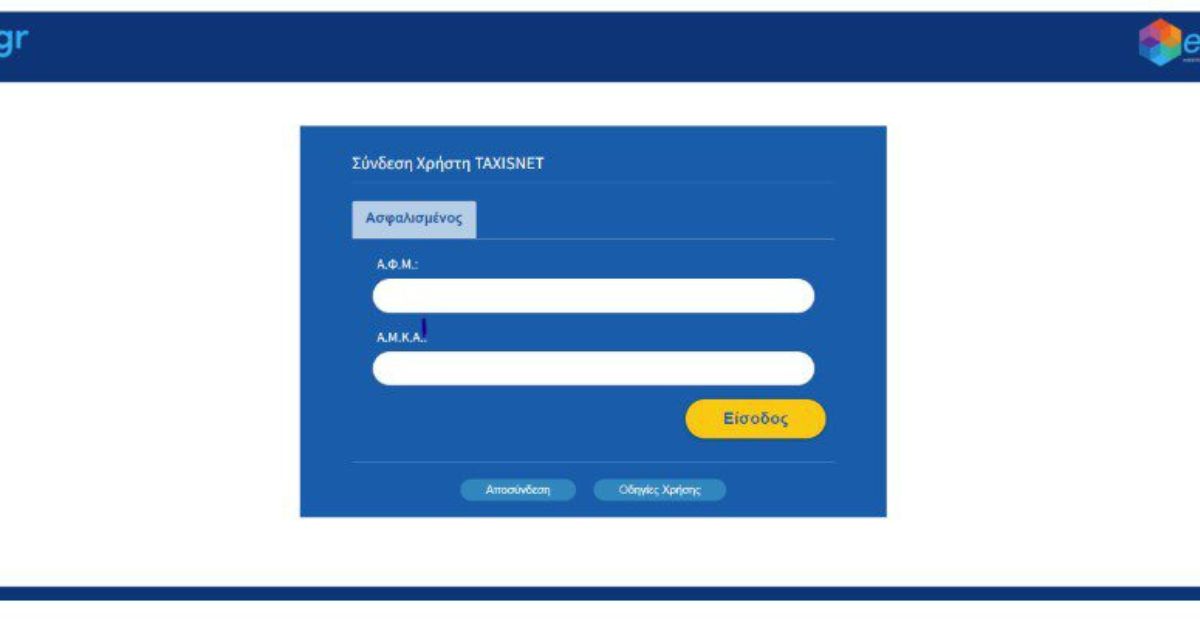 Εφόσον επιλέξουμε την είσοδο με το taxisnet θα εισέλθουμε στο εξής ψηφιακό περιβάλλον όπου πρέπει να καταχωρήσουμε ΑΦΜ και ΑΜΚΑ: