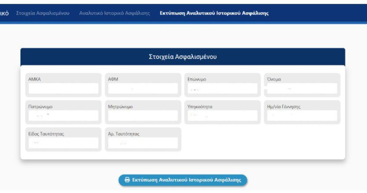 Η όλη διαδικασία θα μας βγάλει στο εξής περιβάλλον όπου θα πρέπει να πατήσετε κλικ στο «εκτύπωση αναλυτικού ιστορικού ασφάλισης» στο πάνω μέρος της οθόνης και να πατήσει «εκτύπωση αναλυτικού ιστορικού ασφάλισης» στο κάτω μέρος της οθόνης.