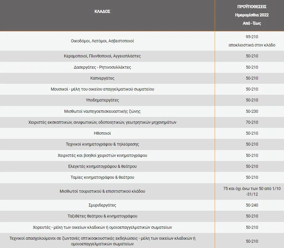 Το σύνολο των ημερομισθίων που έχουν πραγματοποιήσει οι ασφαλισμένοι κατά το ημερολογιακό έτος που προηγείται της καταβολής (το έτος 2022) σε οποιαδήποτε ειδικότητα να μην υπερβαίνει τα 240 ημερομίσθια, για όλες τις κατηγορίες εκτός από τους οικοδόμους.