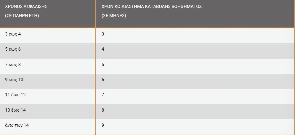 Η διάρκεια καταβολής του βοηθήματος εξαρτάται από τον συνολικό αριθμό των ετών ασφάλισης (συνεχόμενα ή διακεκομμένα) στον αρμόδιο ασφαλιστικό φορέα (ΕΦΚΑ – τ. ΟΑΕΕ ή τ. ΕΤΑΠ – ΜΜΕ), στον οποίο υπαγόταν ο/η δικαιούχος κατά τον χρόνο διακοπής του επαγγέλματός του/της, ως εξής: