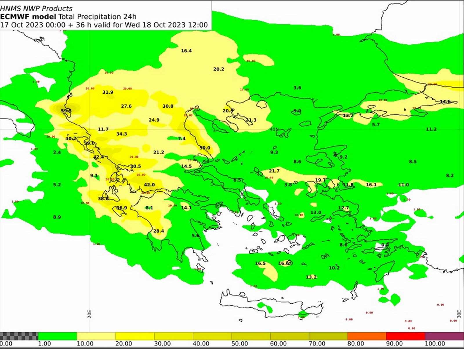 Σύμφωνα με τα διαθέσιμα προγνωστικά στοιχεία του Εθνικού Αστεροσκοπείου Αθηνών / Meteo.gr, από τις μεσημεριανές ώρες της Τρίτης 17/10 οι βροχές στην Ήπειρο, στη Δυτική Στερεά, στα νησιά του Ιονίου και στη Μακεδονία θα ενταθούν και θα σημειωθούν και καταιγίδες. Τα φαινόμενα μετά το απόγευμα θα επεκταθούν στη Θεσσαλία και στη Βορειοδυτική Πελοπόννησο, ενώ κατά τη διάρκεια της νύχτας έως τις πρωινές ώρες της Τετάρτης 18/10 θα επηρεάσουν το Βόρειο Αιγαίο, την Εύβοια και τα υπόλοιπα κεντρικά και νότια ηπειρωτικά τμήματα.