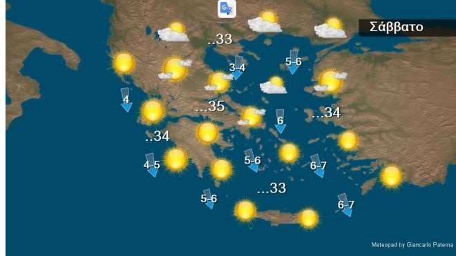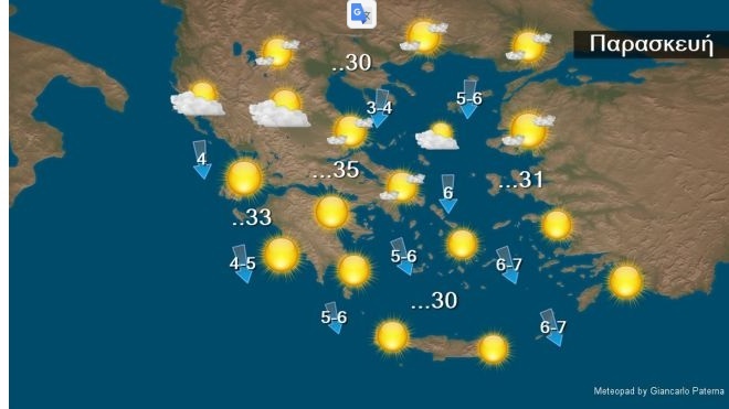 Θερμοκρασία: Από 25 έως 35 βαθμούς Κελσίου. Στα παραθαλάσσια η μέγιστη θα είναι 2 με 3 βαθμούς χαμηλότερη.