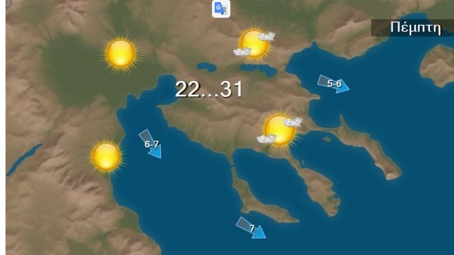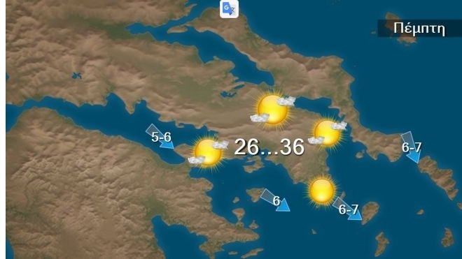 Καιρός σήμερα. Ηλιοφάνεια. Οι άνεμοι θα πνέουν Βορειοδυτικοί 4 με 6 μποφόρ. Η θερμοκρασία έως 37 βαθμούς.