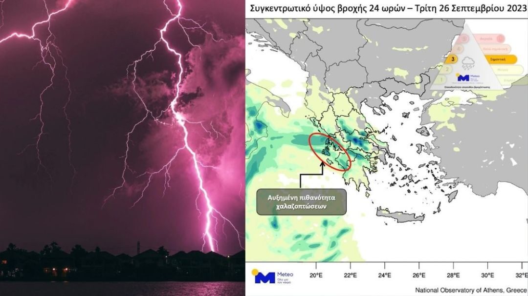 Βροχές και σποραδικές καταιγίδες εκδηλώθηκαν μέχρι το πρωί της Τρίτης 26/09 κυρίως στη Στερεά, στη Δυτική Θεσσαλία και στην Ήπειρο. Σύμφωνα με τα προγνωστικά στοιχεία του meteo.gr/EAA, κατά τόπους και κατά περιόδους ισχυρά φαινόμενα αναμένονται για το υπόλοιπο της ημέρας σε Ιόνιο, Δυτική και Κεντρική Στερεά, Πελοπόννησο και δευτερευόντως σε Θεσσαλία και Ήπειρο. Τα φαινόμενα σε ορισμένες περιοχές θα συνοδευτούν από χαλαζοπτώσεις, κυρίως στη Δυτική Ελλάδα και στα Κεντρικά Επτάνησα.
