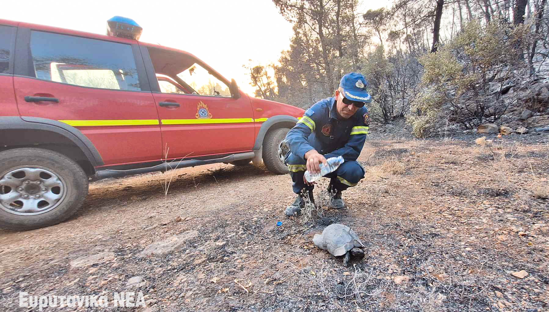 Από τα Δερβενοχώρια έρχεται η φωτογραφία ενός πυροσβέστη της ΔΙ.ΠΥ.Ν. Ευρυτανίας να ρίχνει νερό σε μια χελώνα που κατάφερε να γλιτώσει από τις φλόγες. Το ζώο βρισκόταν ακίνητο, εξαντλημένο και αφυδατωμένο. Χρειαζόταν λίγο νερό για να αρχίσει να περπατά ξανά προς την ελπίδα, μέσα στις στάχτες και τα αποκαΐδια.