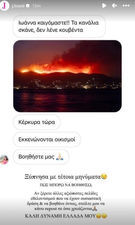 «Ιωάννα, καιγόμαστε. Τα κανάλια σκάνε, δεν λένε κουβέντα! Κέρκυρα, τώρα! Εκκενώνονται οικισμοί, βοηθήστε μας!» της γράφουν, με την Ιωάννα να απαντά δημόσια: