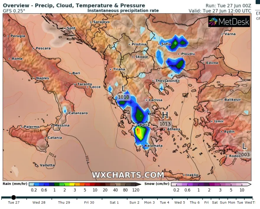 Σήμερα, 27 Ιουνίου, περιορίζεται ο άστατος καιρός. Με τον άστατο καιρό να περιορίζεται προς την περιοχή της κεντρικής και νότιας χώρας, αναμένεται να κυλήσει η σημερινή ημέρα. Δεν θα έχουμε δυνατούς ανέμους. Παρόλα αυτά η αστάθεια περιορίζεται προς την περιοχή της Πελοποννήσου. Εκεί θα είναι οι πιο πολλές βροχές. Την Τετάρτη και την Πέμπτη θα περιοριστεί περισσότερο η αστάθεια προς την Κεντρική και Βόρεια Ελλάδα έως και το Σάββατο. Από την Κυριακή κατεβαίνει πάλι μία διαταραχή για να πυροδοτήσει, για άλλη μία φορά, αυτόν τον άστατο καιρό.