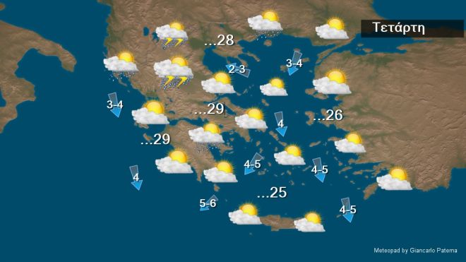 Λίγες νεφώσεις παροδικά αυξημένες. Τοπικές βροχές και μεμονωμένες καταιγίδες θα εκδηλωθούν στα ηπειρωτικά, κυρίως ορεινά, καθώς και στην Κρήτη. Οι άνεμοι θα πνέουν από βόρειες διευθύνσεις 3 με 5 και στο βόρειο Αιγαίο τοπικά 6 μποφόρ. Η θερμοκρασία δεν θα σημειώσει αξιόλογη μεταβολή..