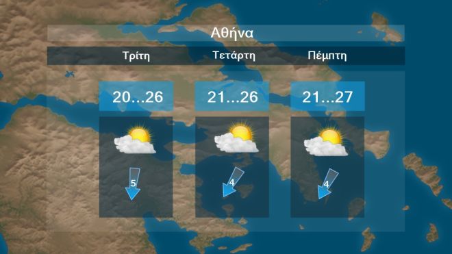 Στην Αθήνα προβλέπονται τοπικές νεφώσεις . Η μέγιστη θερμοκρασία θα κυμαίνεται περί τους 26 με 27 βαθμούς Κελσίου.