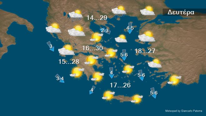 Σήμερα Δευτέρα προβλέπεται γενικά αίθριος καιρός στη χώρα, με πρόσκαιρες νεφώσεις το μεσημέρι και το απόγευμα στα ηπειρωτικά, οπότε στα ορεινά κυρίως της Μακεδονίας και της Ηπείρου, θα εκδηλωθούν τοπικοί όμβροι και πιθανώς στα βόρεια μεμονωμένες καταιγίδες. Η ορατότητα τις πρωινές ώρες στα δυτικά και βόρεια ηπειρωτικά θα είναι τοπικά περιορισμένη και πιθανόν να σχηματιστούν ομίχλες. Οι άνεμοι στα δυτικά θα είναι μεταβλητοί ασθενείς, στα ανατολικά θα πνέουν βόρειοι 3 με 5 και στο Αιγαίο τοπικά 6 μποφόρ. Η θερμοκρασία δεν θα σημειώσει αξιόλογη μεταβολή και θα φτάσει στα ηπειρωτικά τους 28 με 29 και κατά τόπους τους 30 βαθμούς και στα νησιά τους 25 με 27 βαθμούς Κελσίου.