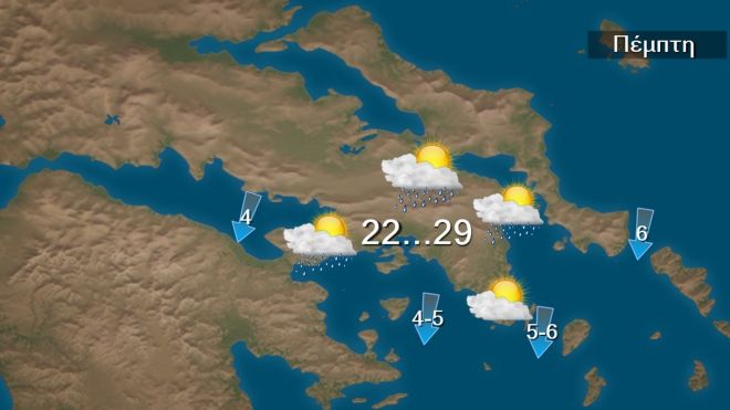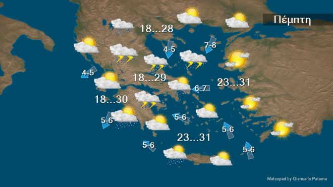 Στα νησιά του ανατολικού Αιγαίου και τα Δωδεκάνησα γενικά αίθριος καιρός. Στην υπόλοιπη χώρα λίγες νεφώσεις κατά τόπους παροδικά αυξημένες, με τοπικές βροχές κυρίως στη Θεσσαλία, τις Σποράδες, την Εύβοια, την ανατολική Στερεά και την Κρήτη. Οι άνεμοι θα πνέουν στα δυτικά ανατολικοί βορειοανατολικοί και στα ανατολικά βόρειοι βορειοανατολικοί, εντάσεως 4 με 6, στα πελάγη τοπικά 7 μποφόρ. Η θερμοκρασία θα σημειώσει μικρή άνοδο και θα φθάσει στα βορειοδυτικά ηπειρωτικά τους 26 με 28 βαθμούς και στην υπόλοιπη χώρα τους 29 με 31 βαθμούς Κελσίου.
