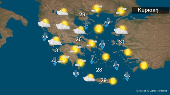 Οι άνεμοι θα πνέουν στα δυτικά ανατολικοί βορειοανατολικοί και στα ανατολικά βόρειοι βορειοανατολικοί 4 με 6, στα πελάγη τοπικά 7 μποφόρ. Η θερμοκρασία θα σημειώσει μικρή άνοδο. Θα φθάσει στα βορειοδυτικά τους 24 με 26, στα υπόλοιπα ηπειρωτικά τους 27 με 30 και στη νησιωτική χώρα τους 29 με 31 βαθμούς Κελσίου.