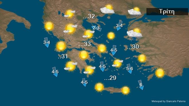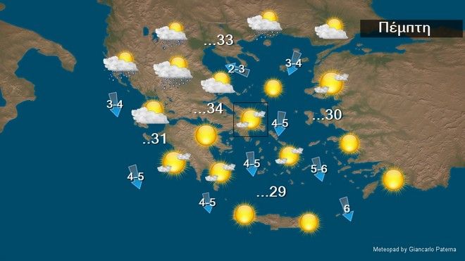 Η θερμοκρασία θα σημειώσει μικρή άνοδο και θα φτάσει στο Ιόνιο και τα ηπειρωτικά τους 33 με 34 και στο Αιγαίο τους 29 με 30 βαθμούς Κελσίου.