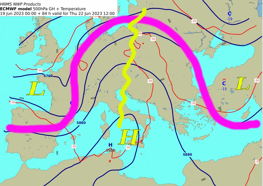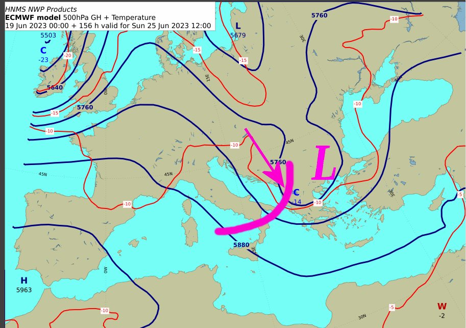 Ο εμποδιστής δεν έφυγε. Απλά μετακινήθηκε λίγο ανατολικά και o αντικυκλώνας μας εγγυάται καλοκαιρία. Πρόσκαιρη αλλαγή την Κυριακή των #εκλογών στα κεντρικά και Βόρεια, όπως διακρίνεται στον χάρτη των 500 hPa με το πέρασμα διαταραχής και ψυχρής μάζας.