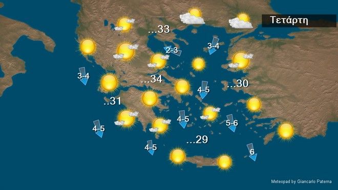 Γενικά αίθριος καιρός, βόρειοι άνεμοι έως 6 μποφόρ και θερμοκρασία έως 34