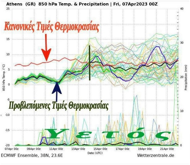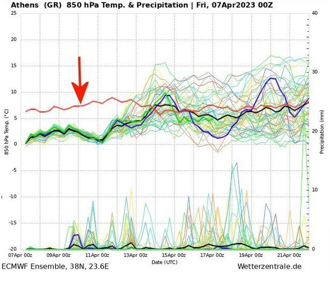 Μετεώγραμμα Αθήνας (Θερμοκρασίες στα 850 hPa και υετός)