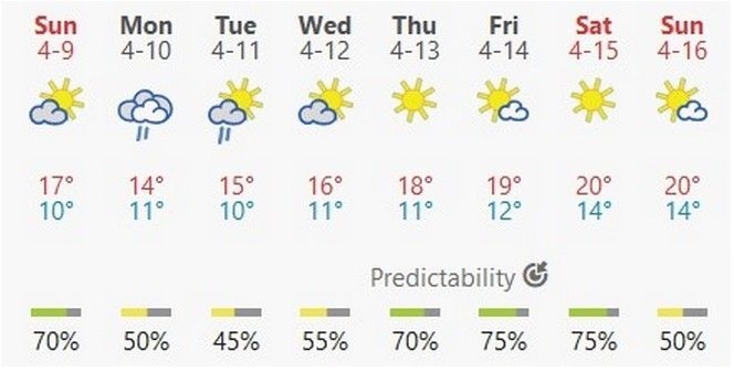 Για την εξέλιξη του καιρού υπάρχουν πολλές αξιόπιστες σελίδες που μπορούν να μας δώσουν με καλές πιθανότητες την προοπτική του καιρού μέχρι το Πάσχα, ακόμη και παραπέρα. Δεν πρέπει πάντως να ξεχνάμε, ότι όσο πηγαίνουμε μακρύτερα χρονικά, τόσο μειώνεται η προγνωσιμότητα της ατμόσφαιρας, κάτι το οποίο αποτυπώνεται και στη διπλανή πρόγνωση για την Αθήνα σύμφωνα με την Meteoblue.