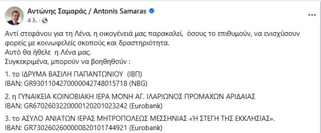 Να βοηθηθούν κοινωφελή ιδρύματα, αντί για στεφάνια για τη Λένα, παρακαλεί η οικογένεια του Αντώνη και της Γεωργίας Σαμαρά. Ειδικότερα, σε ανάρτηση στο προφίλ του πρώην πρωθυπουργού στο facebook αναφέρεται: