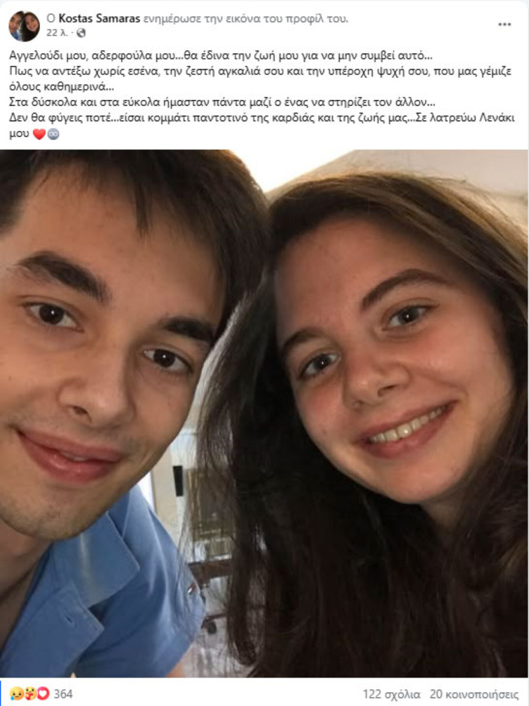 Με ένα μήνυμα σπαραγμού και οδύνης, ο Κώστας Σαμαράς, γιος του πρώην πρωθυπουργού Αντώνη Σαμαρά, αποχαιρετά την αδελφή του, τη Λένα, που έφυγε ξαφνικά από τη ζωή.