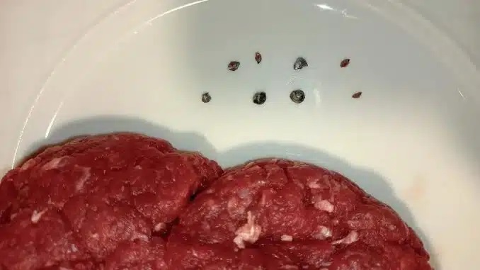 Σύμφωνα με το paidis.com, η γυναίκα υποστηρίζει ότι αρχικά ο γιος της βρήκε τα σκάγια μέσα στα μπιφτέκια που του είχε φτιάξει και στη συνέχεια τα εντόπισε και η ίδια στο κομμάτι του κιμά που δεν είχε χρησιμοποιήσει, όπως μπορείτε να δείτε και στην παρακάτω φωτογραφία.