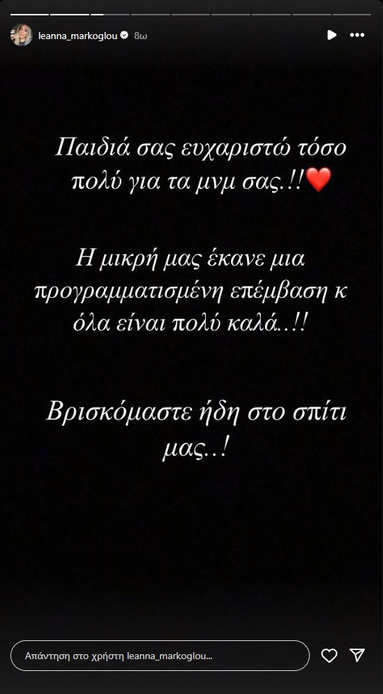 Λίγο αργότερα, η Λεάννα Μάρκογλου προχώρησε σε νέα ανάρτηση, αποκαλύπτοντας πως η κόρη της είχε υποβληθεί σε μια προγραμματισμένη επέμβαση. Ευτυχώς, όλα κύλησαν ομαλά και η μικρή βρίσκεται πλέον στο σπίτι της, όπου αναρρώνει. Η Λεάννα ευχαρίστησε όλους όσους της έστειλαν μηνύματα υποστήριξης, τονίζοντας ότι η κατάσταση της κόρης της είναι σταθερή και η οικογένεια έχει επιστρέψει στην καθημερινότητά της.