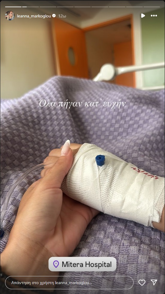 Στην πρώτη της ανάρτηση, η Λεάννα Μάρκογλου δημοσίευσε μια φωτογραφία με το χεράκι της κόρης της, συνοδευόμενη από τη φράση: “Όλα πήγαν κατ’ ευχήν“. Η συγκεκριμένη φωτογραφία ανησύχησε τους ακολούθους της, που έσπευσαν να στείλουν μηνύματα συμπαράστασης και ευχές για γρήγορη ανάρρωση.