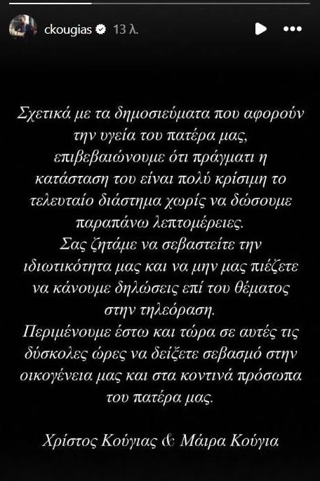 Χαρακτηριστικά ο γιος του Αλέξη Κούγια αναφέρει: «Σχετικά με τα δημοσιεύματα που αφορούν την υγεία του πατέρα μας, επιβεβαιώνουμε ότι πράγματι η κατάστασή του είναι πολύ κρίσιμη το τελευταίο διάστημα, χωρίς να δώσουμε παραπάνω λεπτομέρειες.