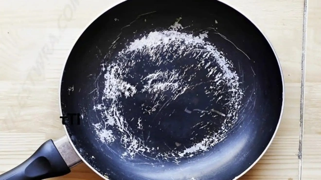 Ζεσταίνουμε το τηγάνι σε μέτρια φωτιά. Προσθέστε μια λεπτή στρώση χοντρό αλάτι και αφήστε το να ζεσταθεί για λίγα λεπτά. Χρησιμοποιήστε μια χαρτοπετσέτα για να τρίψετε το αλάτι στην επιφάνεια,αλλά φορέστε γάντια για να αποφύγετε εγκαύματα. Πετάξτε το αλάτι και ξεπλύνετε το τηγάνι. Αυτή η τεχνική εξομαλύνει τις μικρές γρατζουνιές και βελτιώνει την αντίσταση στα κολλήματα.