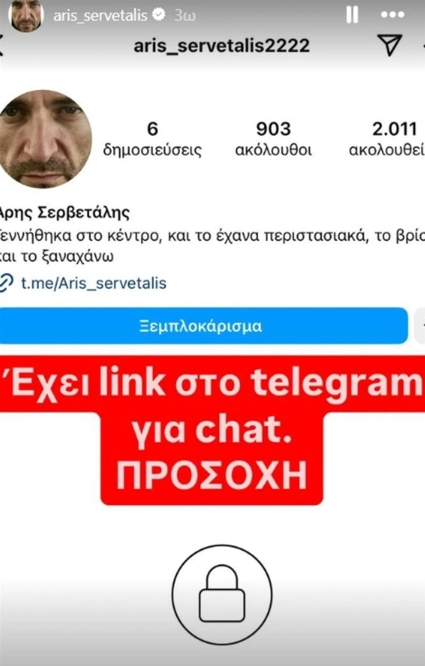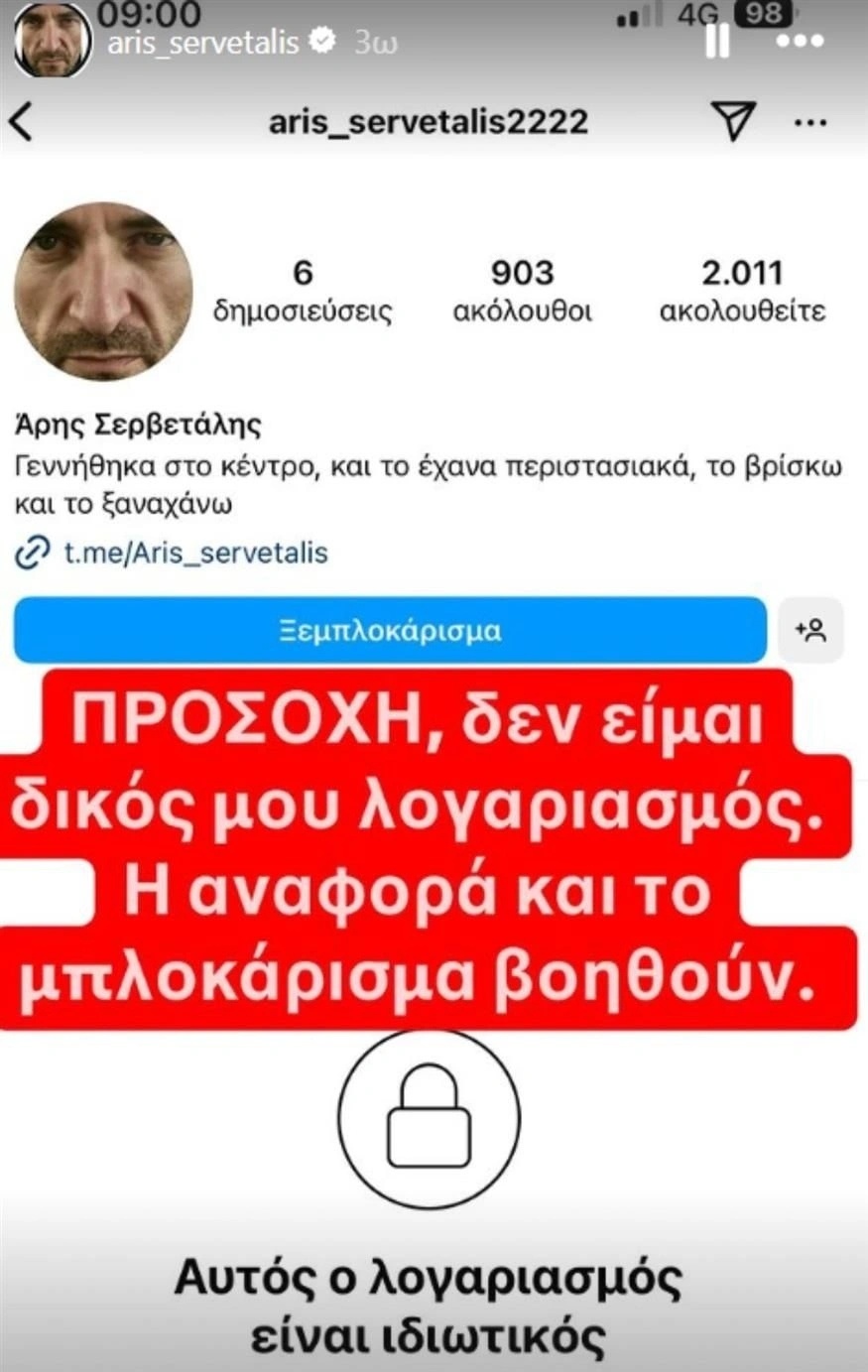 Στο story του, ο Άρης Σερβετάλης ξεκαθαρίζει ότι ο λογαριασμός δεν είναι δικός του. Συγκεκριμένα, γράφει: «Προσοχή. Δεν είναι δικός μου λογαριασμός. Η αναφορά και το μπλοκάρισμα βοηθούν».