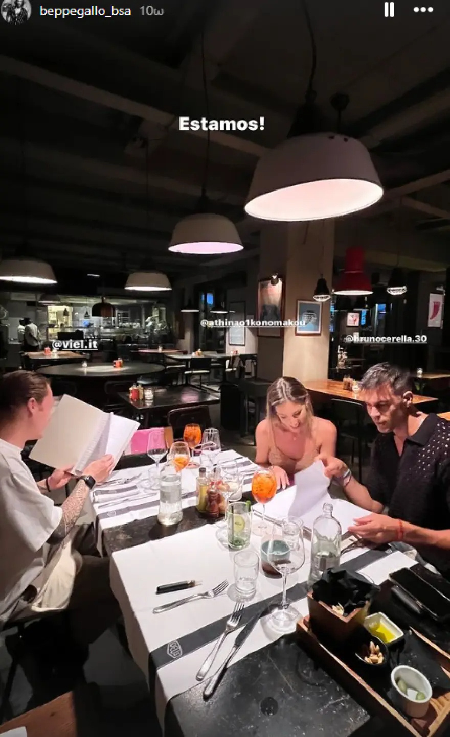 Το ζευγάρι βρέθηκε μαζί με έναν φίλο που λέγεται Μπέπε Γκάλο, σε ένα εστιατόριο στο Μιλάνο. Ο Γκάλο, ανάρτησε σε Instagram story την Αθηνά Οικονομάκου να κάθεται δίπλα στον σύντροφό της και απαθανάτισε σε βίντεο, το ζευγάρι να διασκεδάζει.