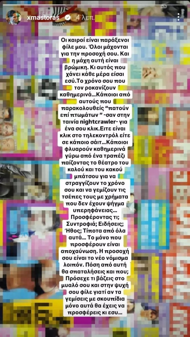 Μετά την πρόσφατη αντίδρασή του στις ερωτήσεις των δημοσιογράφων σχετικά με τη Μαρινέλλα, ο Χρήστος Μάστορας έκανε μια μακροσκελή ανάρτηση στον λογαριασμό του στο Instagram. Στο κείμενο, ο γνωστός καλλιτέχνης δεν διστάζει να εκφράσει την έντονη δυσαρέσκειά του για τον τρόπο που λειτουργούν ορισμένες τηλεοπτικές εκπομπές και παρουσιαστές.