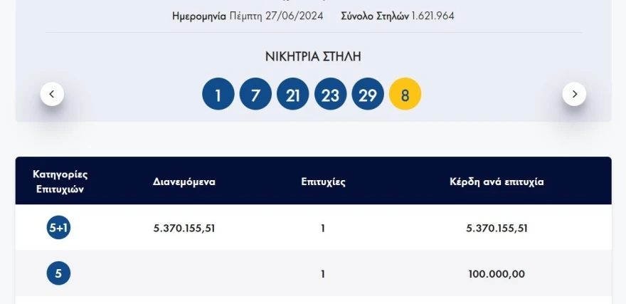 Η κλήρωση του τζόκερ που έγινε την Πέμπτη 27/6, ανέδειξε έναν μοναδικό νικητή που κέρδισε 5,3 εκατ. ευρώ.