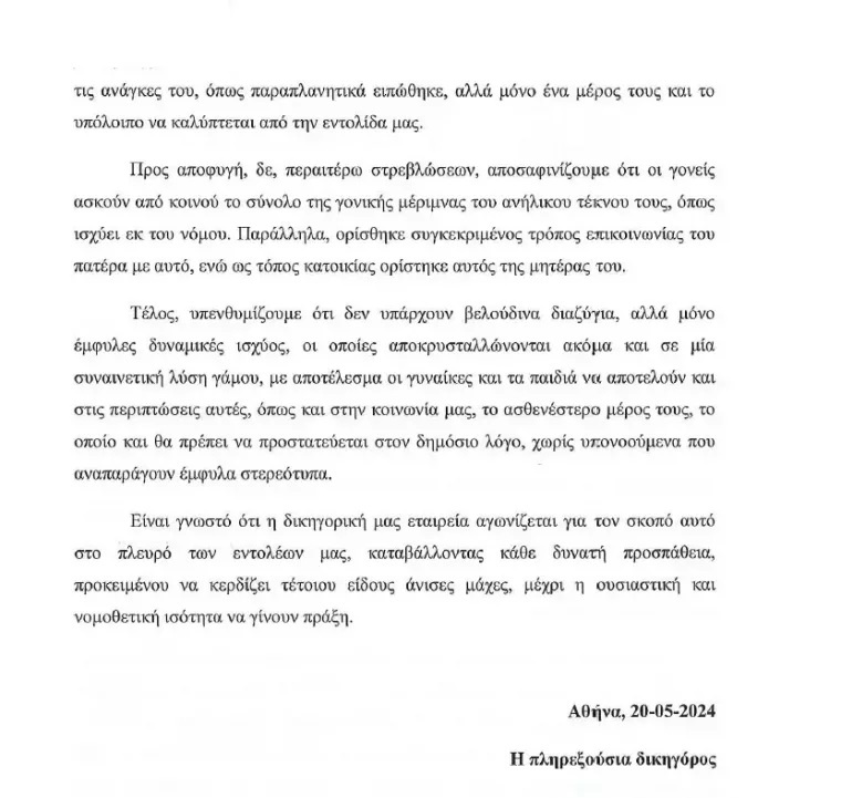 Από την αρχή των διαπραγματεύσεων η εντολέας μας όχι μόνο δεν είχε υπερβολικές απαιτήσεις, όπως ακούστηκε ή μπορεί να ερωτήθηκε, αλλά λειτουργούσε με μοναδικό κίνητρο την εξυπηρέτηση των συμφερόντων της ανήλικης κόρης, όπως νομικά και ηθικά όφειλε, χωρίς ποτέ να διεκδικήσει τίποτα περισσότερο από όσα αναλογούν στις πραγματικές ανάγκες του τέκνου και το επίπεδο ζωής που απολάμβανε κατά τη διάρκεια του γάμου, όπως ρητά ορίζει ο νόμος.