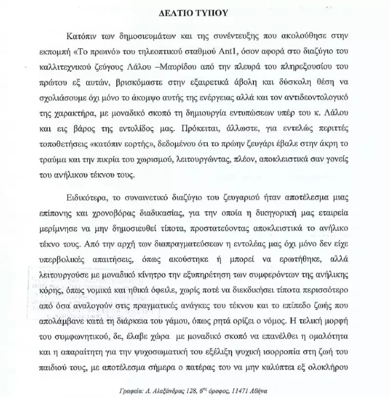 Κατόπιν των δημοσιευμάτων και της συνέντευξης που ακολούθησε στην εκπομπή «Το πρωινό» του τηλεοπτικού σταθμού Ant1, όσον αφορά στο διαζύγιο του καλλιτεχνικού ζεύγους Λάλου – Μαυρίδου από την πλευρά του πληρεξουσίου του πρώτου εξ αυτών, βρισκόμαστε στην εξαιρετικά άβολη και δύσκολη θέση να σχολιάσουμε όχι μόνο το άκομψο αυτής της ενέργειας, αλλά και τον αντιδεοντολογικό της χαρακτήρα, με μοναδικό σκοπό τη δημιουργία εντυπώσεων υπέρ του κου Λάλου και εις βάρος της εντολίδος μας.