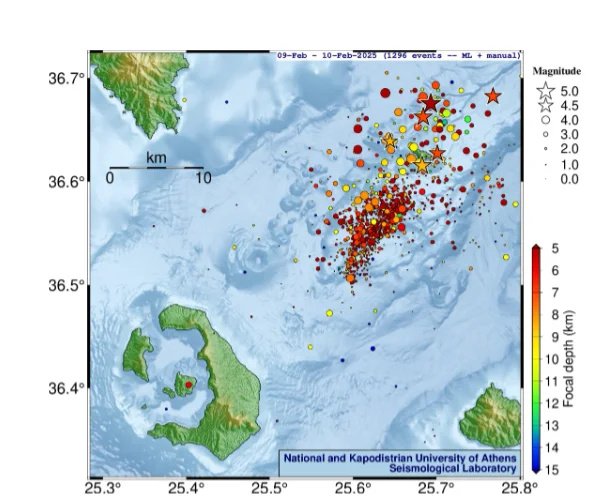 «Από την έναρξη της σεισμικής δραστηριότητας στη ζώνη Σαντορίνης-Αμοργού στις 26 Ιανουαρίου έως και τις 9 Φεβρουαρίου 2025, το Εργαστήριο Σεισμολογίας (ΕΣ) του ΕΚΠΑ (http://dggsl.geol.uoa.gr/) έχει ανιχνεύσει και εντοπίσει συνολικά, με αυστηρά κριτήρια για τη διασφάλιση της ποιότητας των αποτελεσμάτων, πάνω από 14,000 σεισμούς με μεθόδους μηχανικής μάθησης (τεχνητής νοημοσύνης), εκ των οποίων περίπου 12,000 με μεγέθη Μ³1.0. Στις 9 Φεβρουαρίου καταγράφηκαν πάνω από 1,100 σεισμοί, με ~240 να έχουν μέγεθος Μ³2.5, 14 σεισμούς με Μ³4.0, και 2 σεισμούς με Μ³4.5, με τον μεγαλύτερο σεισμό να έχει μέγεθος M=5.0.