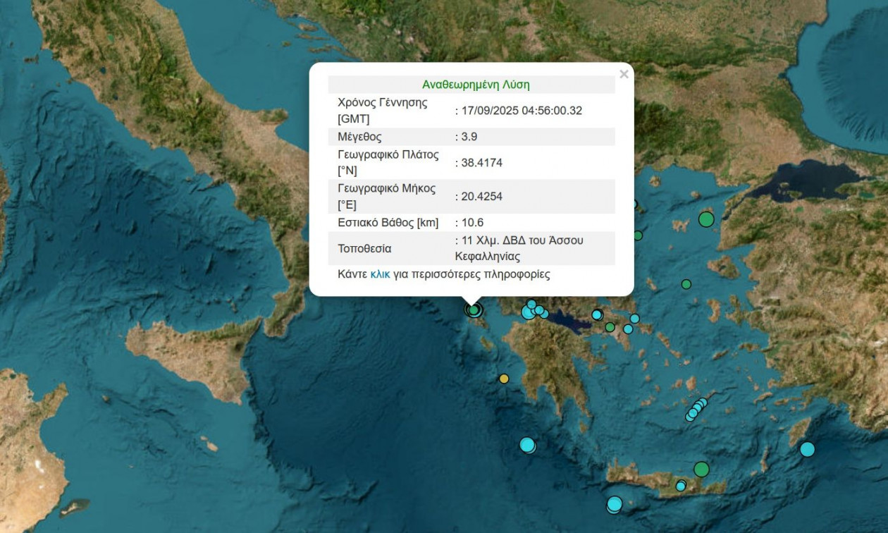 Σεισμός 3,9 βαθμών της κλίμακας Ρίχτερ, σημειώθηκε το πρωί της Τετάρτης (17/9) κοντά στις βόρειες ακτές της Κεφαλονιάς.