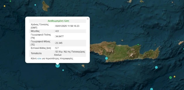 Το επίκεντρο βρίσκεται 52 χλμ. ΝΔ της Παλαιόχωρας Χανίων, με εστιακό βάθος τα 5,7 χλμ.