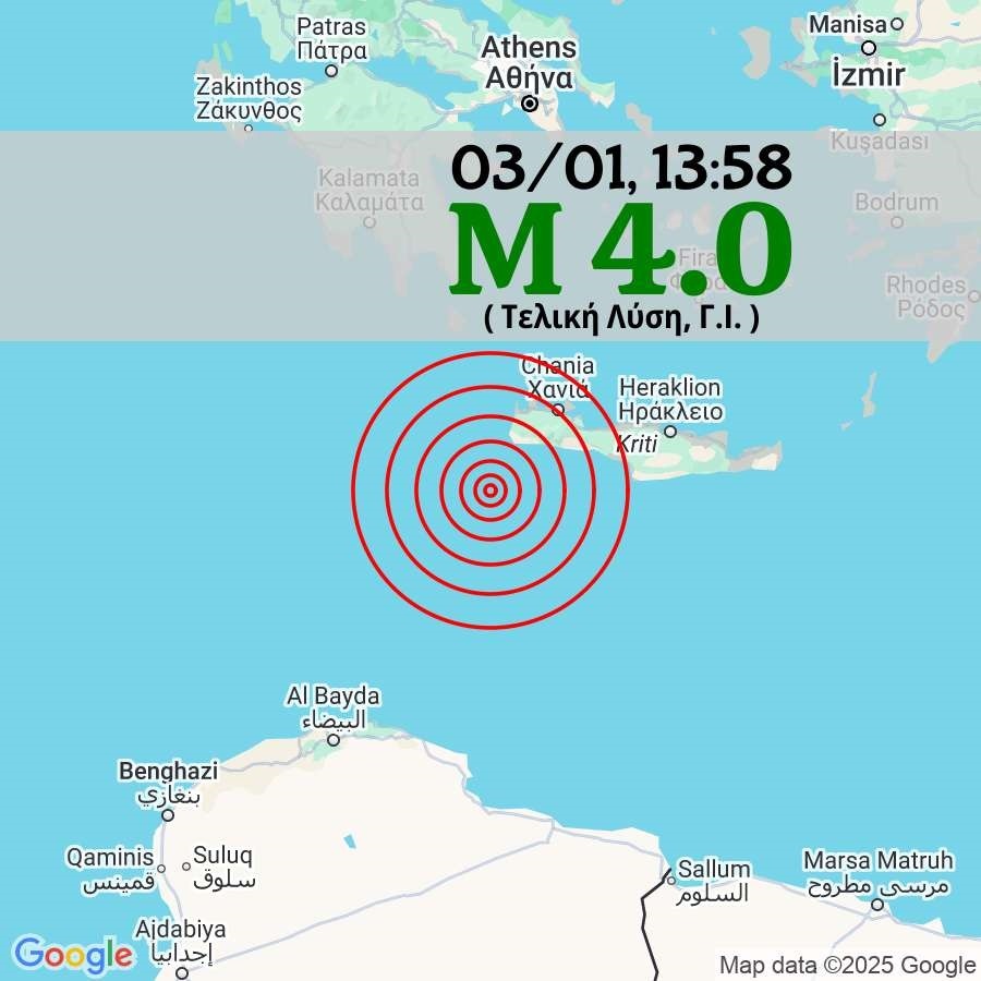(ΔΙΟΡΘΩΣΗ) 4️⃣0️⃣ 🟢 Σεισμός M 4.0, 03/01 13:58, βάθος 5 χλμ., 52 χλμ. ΝΔ από Παλαιοχώρα.